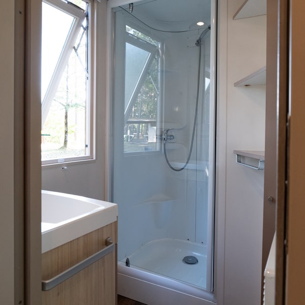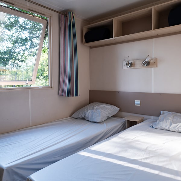 Ideal for families or groups stopping off in Nançay! This well-designed mobile home offers comfort combined with the friendliness of camping. Two cosy bedrooms, a spacious living room and a covered terrace with a lovely view of the surrounding woods (because it’s much nicer that way), perfect for evenings under the stars whatever the season.